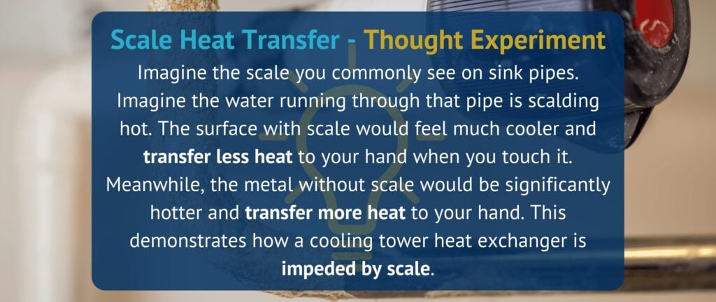 Scale remediation strategies will depend on the water chemistry of your cooling tower. Is it “hard water” with large amounts of total dissolved solids like calcium carbonate and magnesium silicate? Or is it considered “soft water” with a small amount of minerals present? In addition to total dissolved solids making water hard or soft, solubility is also another important consideration. Solubility is the point at which dissolved solids (scale) are removed from the water. Solubility increases with higher temperatures and at higher pHs. Therefore, we can take away 3 water chemistry factors that cause scale in cooling towers: